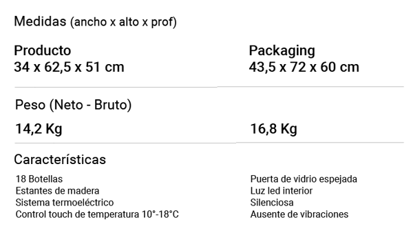 Este modelo es ideal para aquellas personas que quieren almacenar sus vinos en las condiciones óptimas de guarda, pero que no cuenta con amplios espacios en su hogar. Es perfecto para vinos tintos y, dadas sus dimensiones, puede ir perfectamente sobre un mueble o una mesada. La cava T18 cuenta con capacidad para 18 botellas estándar de 750ml y 35cm de largo. Tiene marco de acero inoxidable, es silenciosa, y su luz interna led de color azul aporta sofisticación y elegancia al ambiente donde la luzca, sin dañar su colección de vinos.