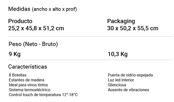 Este modelo es ideal para aquellas personas que quieren almacenar sus vinos en las condiciones óptimas de guarda, pero que no cuentan con amplios espacios en su hogar. Es perfecto para vinos tintos y, dadas sus dimensiones, puede ir perfectamente sobre un mueble o una mesada. La cava T8 tiene capacidad para 8 botellas estándar de 750ml y 30cm de largo. Cuenta con marco de acero inoxidable, es silenciosa, y su luz interna led de color azul aporta sofisticación y elegancia al ambiente sin dañar su colección de vinos.