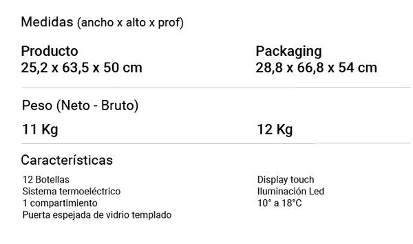 Cava de vinos Vondom Limited para 12 botellas. Este modelo es ideal para quienes buscan almacenar sus vinos en condiciones óptimas de conservación y disponen de espacios reducidos. Adecuada para vinos tintos, sus dimensiones permiten ubicarla sobre un mueble o mesada. La cava T12FLAT tiene capacidad para 12 botellas estándar, puerta espejada, opera de manera silenciosa y su iluminación interna LED azul aporta sofisticación al ambiente sin afectar la calidad de los vinos.