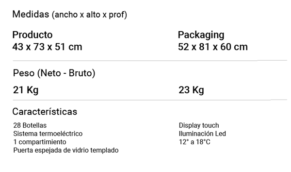 Gracias al sistema termoeléctrico, la cava es silenciosa, eficiente y sin compresores, ideal para colocar en livings, cocinas o espacios reducidos. No sólo conserva, sino que realza el placer de elegir, servir y compartir un buen vino