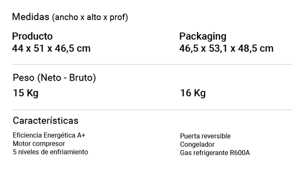 El uso de gas refrigerante R600A lo hace una opción amigable con el medio ambiente, ya que este tipo de refrigerante es más eficiente y reduce el impacto ambiental. Con su bajo nivel de ruido y desempeño confiable, este frigobar es la opción ideal para quienes buscan comodidad y calidad en un solo producto.
