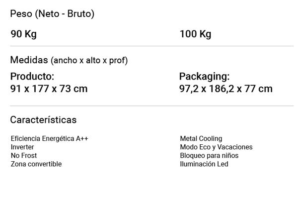 Además, cuenta con tecnología "Metal Cooling" que utiliza superficies metálicas para distribuir el frío de manera uniforme y mantener la temperatura constante. Conserva tus alimentos frescos por más tiempo, reduce el consumo energético y aporta un diseño moderno a tu cocina.